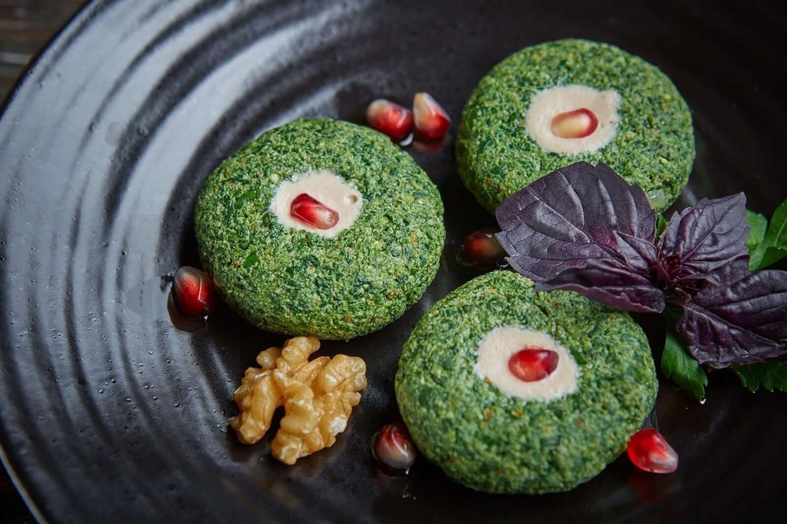 Выкладываем их на тарелку, украшаем орехами, зеленью и зернами граната.