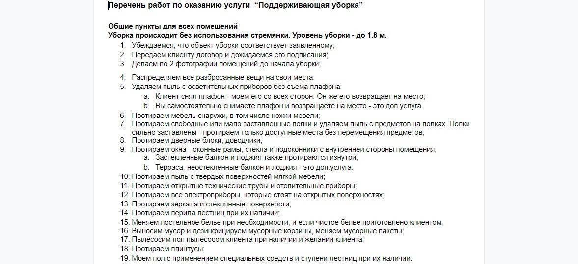 Отрывок из нашего регламента по проведению поддерживающей уборки
