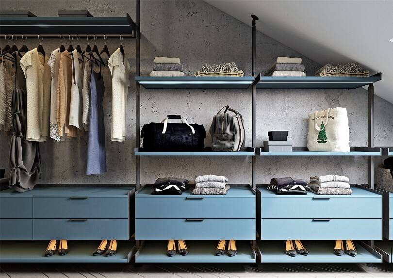 4. Полками. Они бывают выдвижными и стационарного типа. Их ширина не может быть меньше 30 см. Под потолок можно крепить более широкие полки и использовать их как антресоли, заполняя чемоданами, коробками, редко используемым инвентарем и сезонной одеждой.