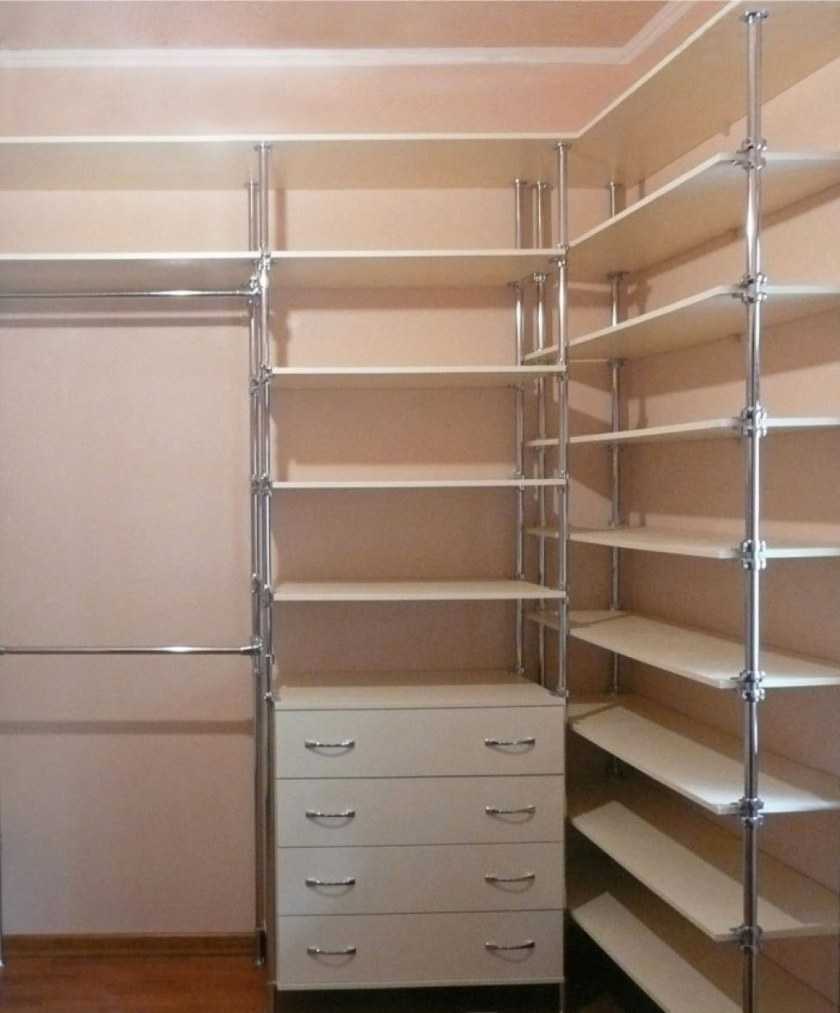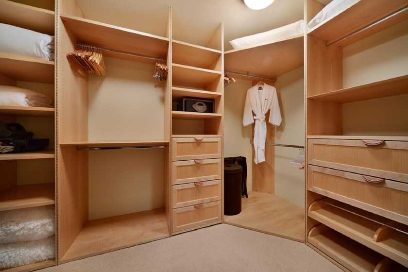 В ней делается дверь, через которую вы сможете беспрепятственно проникнуть вовнутрь. Для обустройства угловой гардеробной подойдут угловые полки и шкафы.
