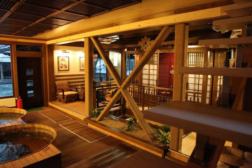 Пространство внутри существенно отличается от популярных бань: русской или финской. Парная в этом случае отсутствует. Вместо этого имеется помещение, оборудованное двумя деревянными емкостями. Для сохранения достаточно высокой температуры стены следует утеплить. Для этого хорошо может подойти вагонка из липы или осины. Следует понимать, что искусственные материалы в японской бане неуместны.