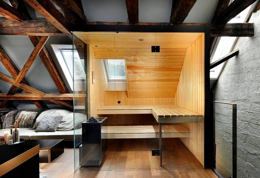 Баня с мансардой имеет площадь около 14-15 квадратных метров. Второй этаж используют в качестве комнаты отдыха. Если вы размещаете баню 3 на 3 на даче, то можно сделать гостевую. В таком случае удобно будет оставаться с ночевкой.