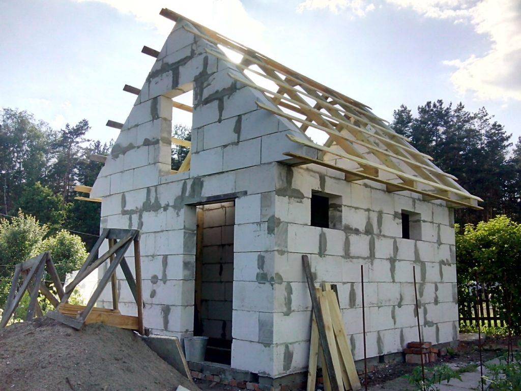 Следующую неделю выполнял кладку стен и фронтонов. И здесь без помощника уже не обойтись. Блоки ПГС в процессе кладки обильно смачивал водой, иначе кладочная смесь мгновенно впитывается в материал.