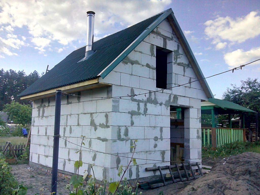 Перемычки над окнами и дверями установил из стального уголка. Затем приступил к изготовлению и установке балок перекрытия, стропильной системы и обрешетки.