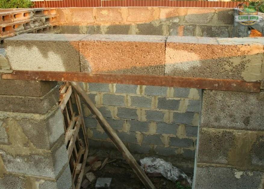 Для формирования дверных и оконных проемов, по верху делался прогон из уголков. На них опирался следующий венец керамзитобетонных блоков.