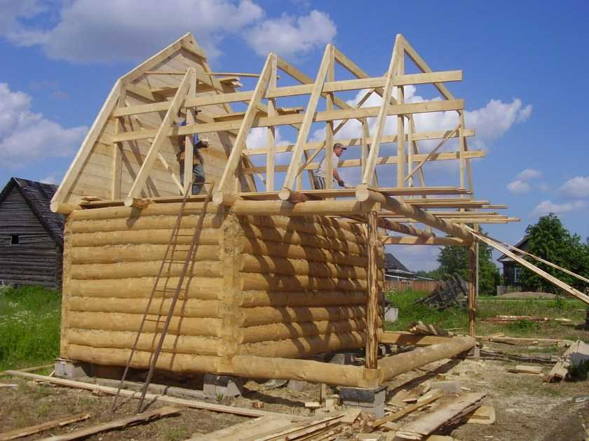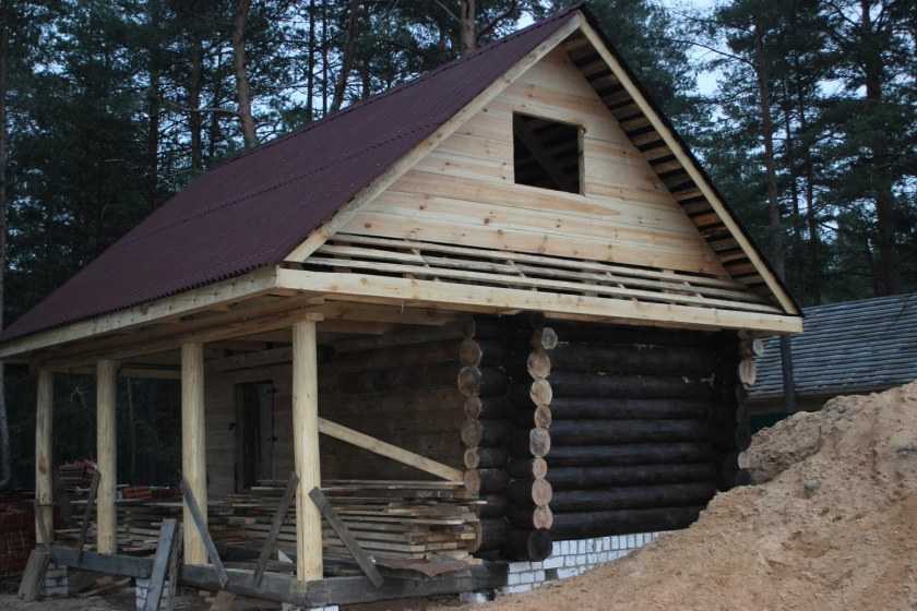 Делается гидроизоляция рубероидом, с укладкой мха поверх бревен, толщиной до 3 см. Дерево не должно прощупываться подо мхом. На веранде мох не нужен, здесь не так нужна равномерность. После этого начинается изготовление стропил из досок 50х150 мм. Стропила покрывают пароизоляцией и контробрешеткой из реек 20х50 мм.