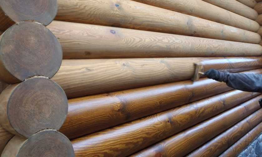 Затем готовим сруб к окрашиванию. Будет обрабатываться бревно повсеместно, с торца обязательно – это самый рыхлый участок, который может спровоцировать порчу бревна.