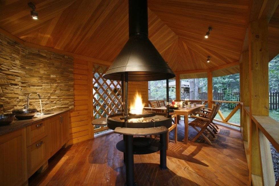 - Привычную гостиную заменяет открытая терраса или беседка с камином.