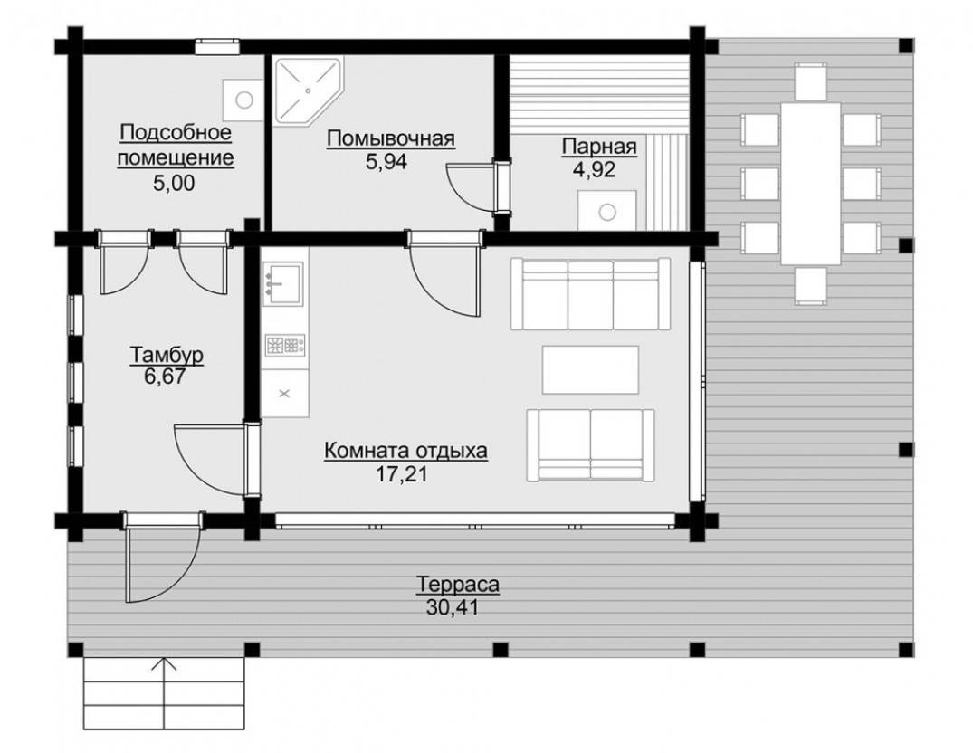Данная планировка включает в себя огромную комнату отдыха, среднюю мойку и разумеется парилку. Эта баня рассчитана для большой семьи, компании, благодаря своим размерам и комнате отдыха.