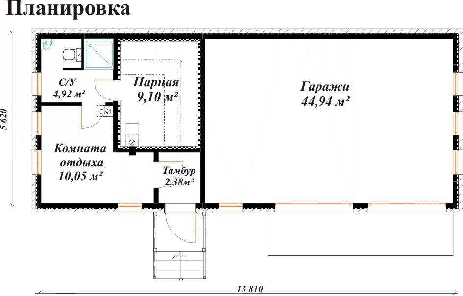 Основным недостатком такой конструкции является смежная стена между гаражом и банной комнатой, которую нужно будет тщательно уплотнять и изолировать с двух сторон. Однако такая планировка позволяет вам компактно разместить под одной крышей банно-гаражный комплекс, комнату для отдыха, санузел и тамбур.