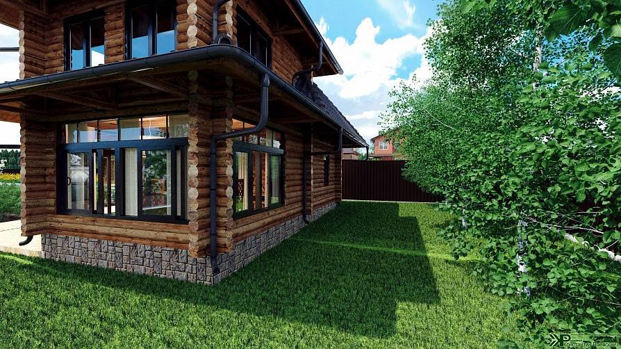 Фасад дома будет отличаться грубыми высокими окнами, иногда даже делают одно окно на два этажа. При этом рамы для них выбираются грубые и массивные.