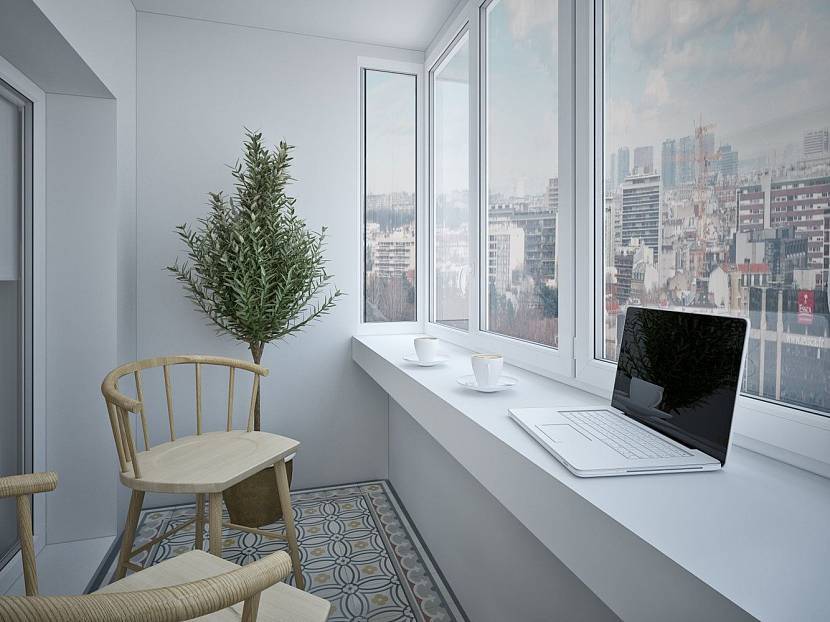 На фото меблировка лоджии в скандинавском стиле в интерьере квартиры.