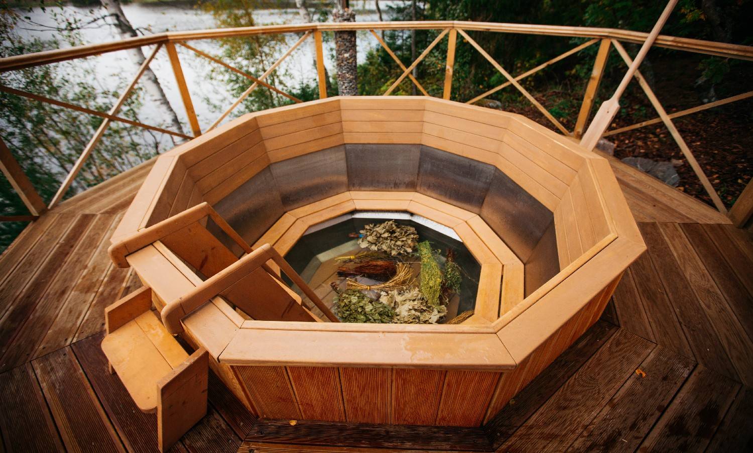 Находиться в воде рекомендуется по уровню груди в течении 10-20 минут. Такие же рекомендации в японской бане «Офуро», про которую мы вам уже рассказывали. Затем нужно окунуться в прохладный водоём и вернуться. Для достижения лучших целебных эффектов, оптимальное время нахождения в банном чане – около часа. Тёплый чай из разнообразных трав, лесных ягод, малины, липы – отличное дополнение к таким процедурам.