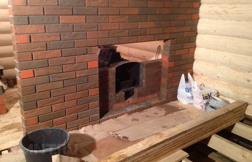 Встроенные конструкции монтируются на специальном постаменте из металлической профилированной трубы. Один из вариантов – постамент закрывается и отделывается огнеупорным декоративным материалом: кирпичом, камнем, терракотовой плиткой и так далее.