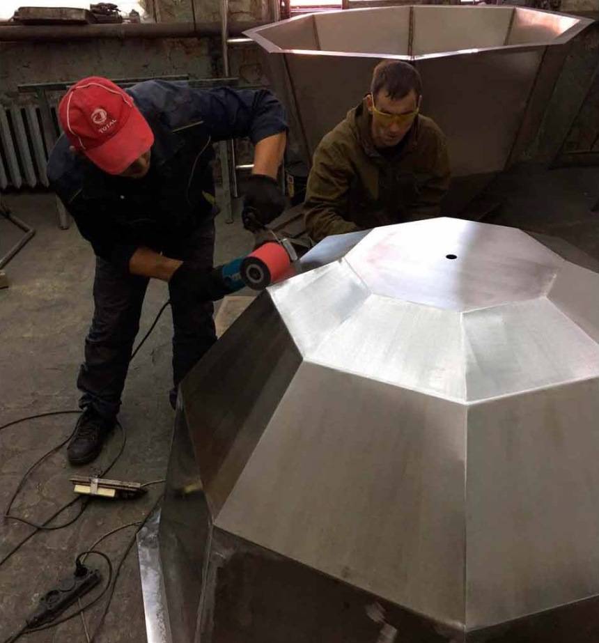 Из листового металла вырезают части по реальным размерам и изгибают с заданным радиусом для достижения диаметра в 2 или больше метров. Стенки не проваривают цельным швом, их закрепляют прихватками, чтобы внести корректировку, если она понадобится.