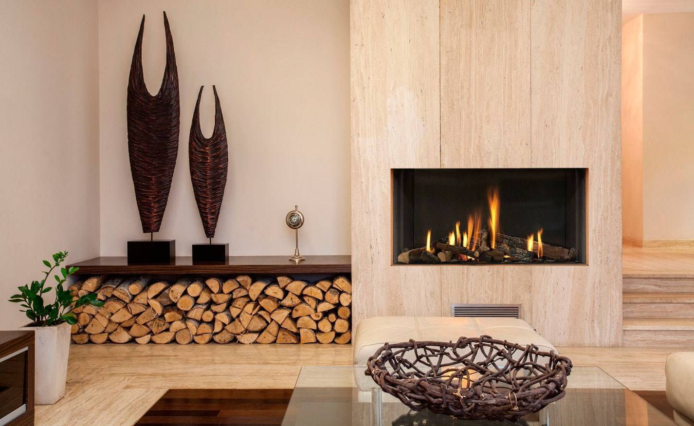 Оригинально смотрится камин, встроенный в стену. Он внешним видом разрушает все наши представления о классических топках в помещении. Увидеть пламя на определенной высоте от пола – настоящее чудо.