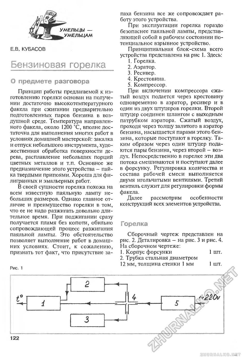 Принцип работы предлагаемой к изготовлению горелки основан на получении достаточно высокотемпературного факела при сжигании предварительно подготовленных паров бензина в воздушной среде. Температура направленного факела, около 1200 «С, вполне достаточна для выполнения многих работ в условиях домашней мастерской: закалка и отпуск небольшого инструмента, художественная обработка поверхности дерева, расплавление небольших порций цветных металлов и т.п. Основное же предназначение этого устройства — пайка твердыми припоями. Хороша для филигранных и эмальерных работ.
