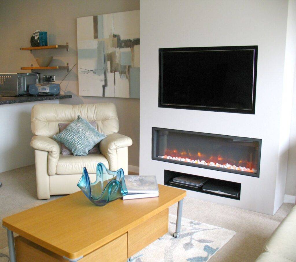 Если в комнате будет находиться камин, то лучше его поместить ниже экрана и включать при неработающем телевизоре. В один ряд их располагать не рекомендуется