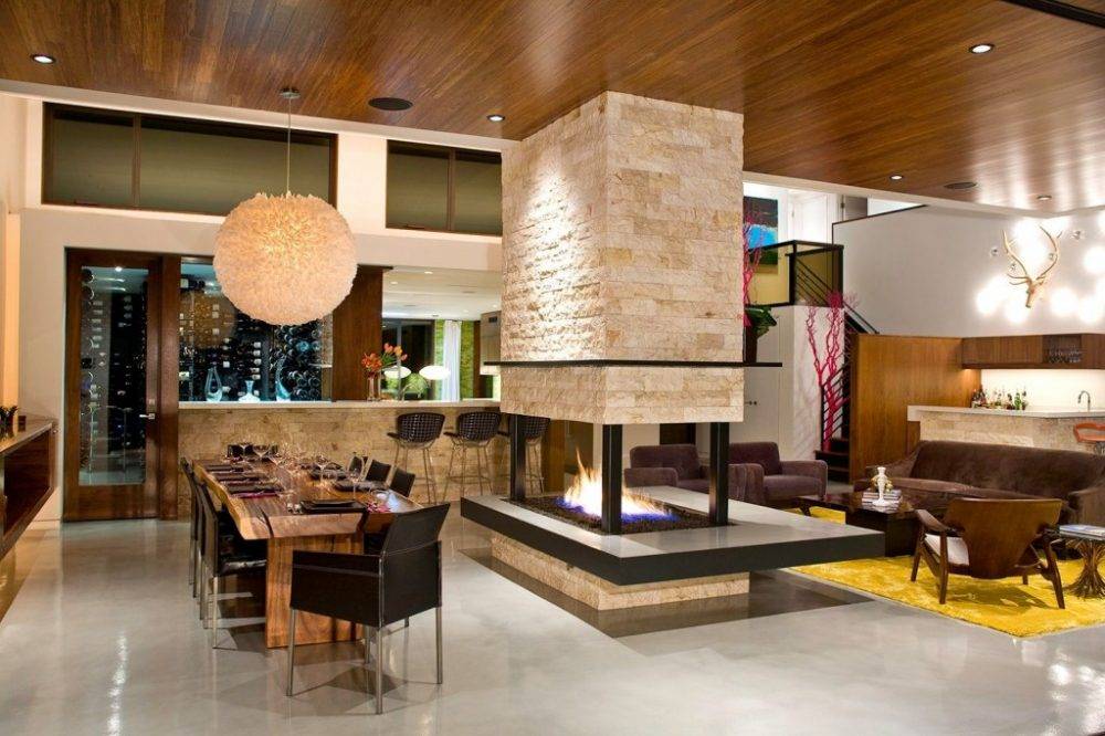 Двухсторонний камин, встроенный в стену, расположенную между двумя смежными комнатами, — это камин, который не только дает возможность любоваться языками огня сразу из двух помещений, но и элемент, связующий интерьеры разных помещений дома в единое целое, создающий гармоничную и завершенную концепцию стилевого оформления дома.