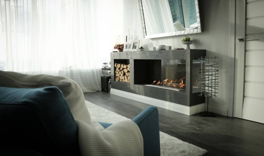 Композиционный центр квартиры — камин с необычной конструкцией, которая не утяжеляет пространство