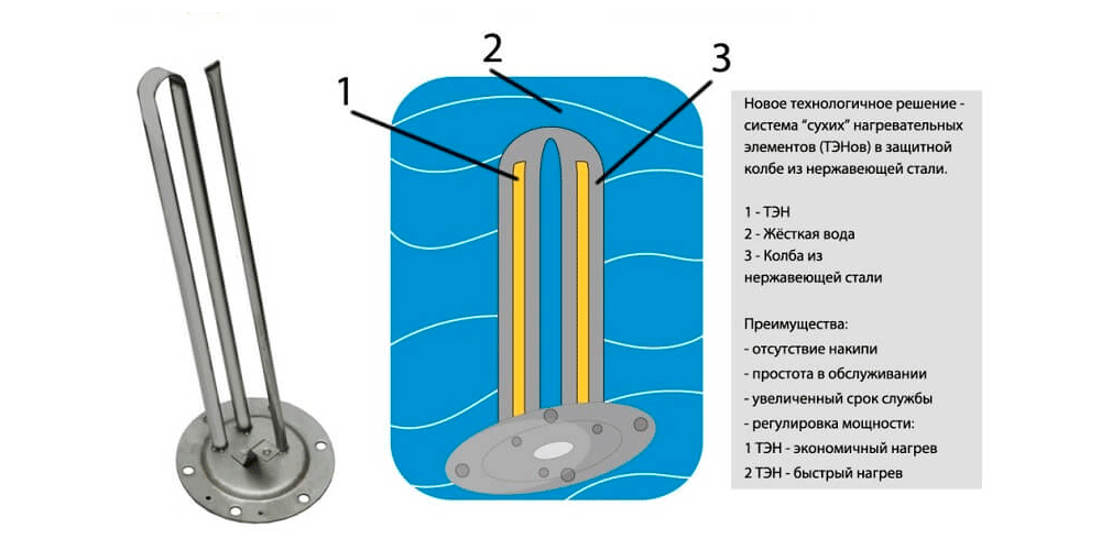Сухой нагревательный элемент защищён от подобной неприятности. В этом случае прямой контакт с водой не происходит. Значит, и накипи на нагревателе тоже нет.