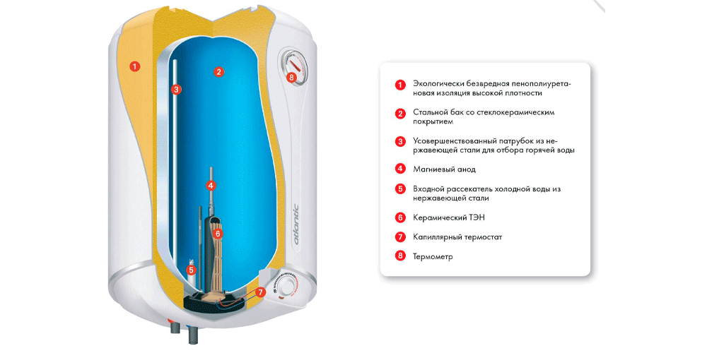 В накопительном водонагревателе Atlantic Steatite Cube VM 100 S4 сухой стеатитовый греющий элемент способен работать в экономичном режиме. Температура нагрева жидкой среды контролируется капиллярным термостатом, что позволяет добиться экономии до 15% энергоресурсов. Внутренние плоскости бака, как и поверхность колбы, имеют эмалевое покрытие с антибактериальными свойствами.