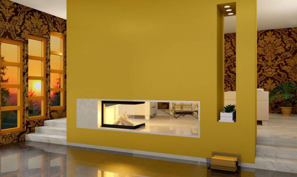 Особенностью такого варианта является возможность установки сквозной металлической топки с двухсторонней или трехсторонней отделкой жаропрочным стеклом. Помимо этого можно сделать топку с одной стороны, а заднюю часть декорировать натуральным камнем.