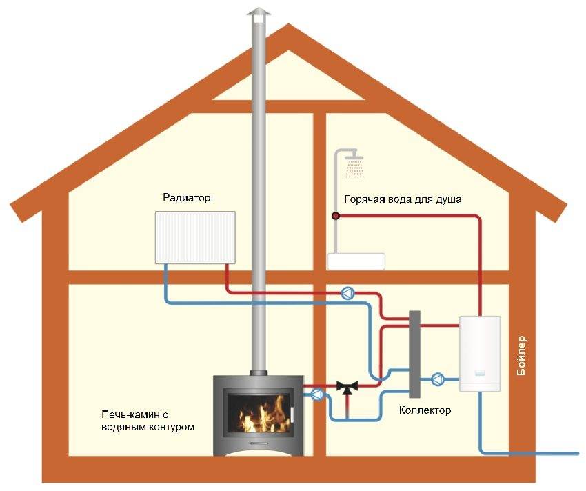 Печь-камин с водяным контуром в комбинированной системе отопления и горячего водоснабжения загородного дома