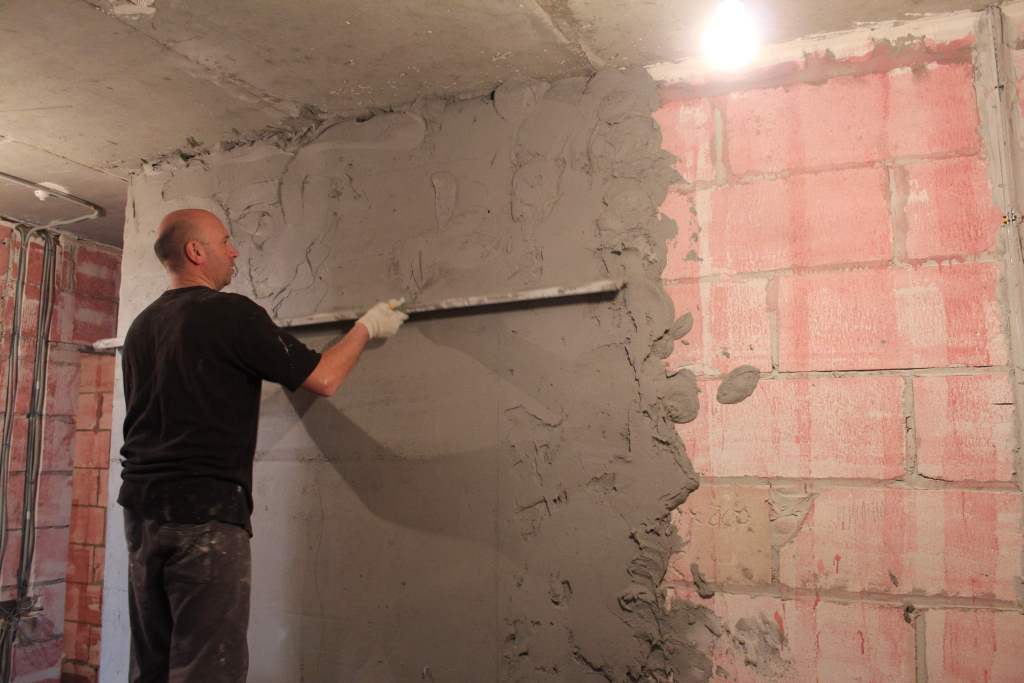 | Обрызг или нанесение первого штукатурного слоя | Цель этой работы – выравнивание стены с применением строительного правила. | Стена становится ровной, основные ямки выравниваются с плоскостью основания. |