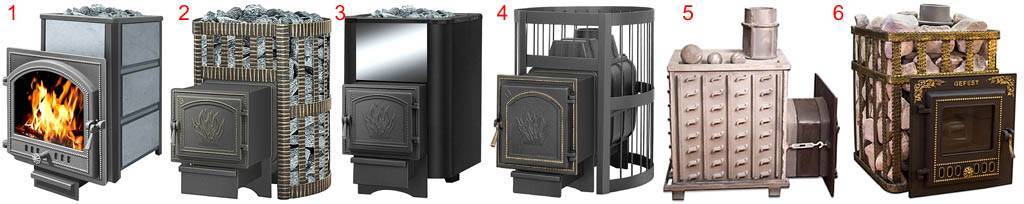 Конструкции банных печей сложились вполне и ничего принципиально нового в них за последние годы не внесено. Печи Вулкан чугунной серии Легенда (поз. 1-4 на рис.) и Гефест (поз. 5 и 6) неспециалист на глаз не отличит друг от друга. Марки чугуна, из которого они изготовлены, найти трудно – ноу-хау фирмы. Но их создатели соблюдают основной принцип конструирования банных чугунных печей: не гнаться за прочностью чугуна. Чем меньше в нем углерода, тем лучше чугун пропускает ИК, необходимые для прогрева каменки. Исключение – вентилирумая каменка, но в сауне ее нужно греть очень долго, а в русской бане ядреного пара от нее не получишь. И в то же время низкоуглеродистый чугун более жаропрочен. Поэтому, если будете выбирать банную печь по марке чугуна, смотрите. Чтобы первое число в ее обозначении было ближе к указанным выше нижним пределам.