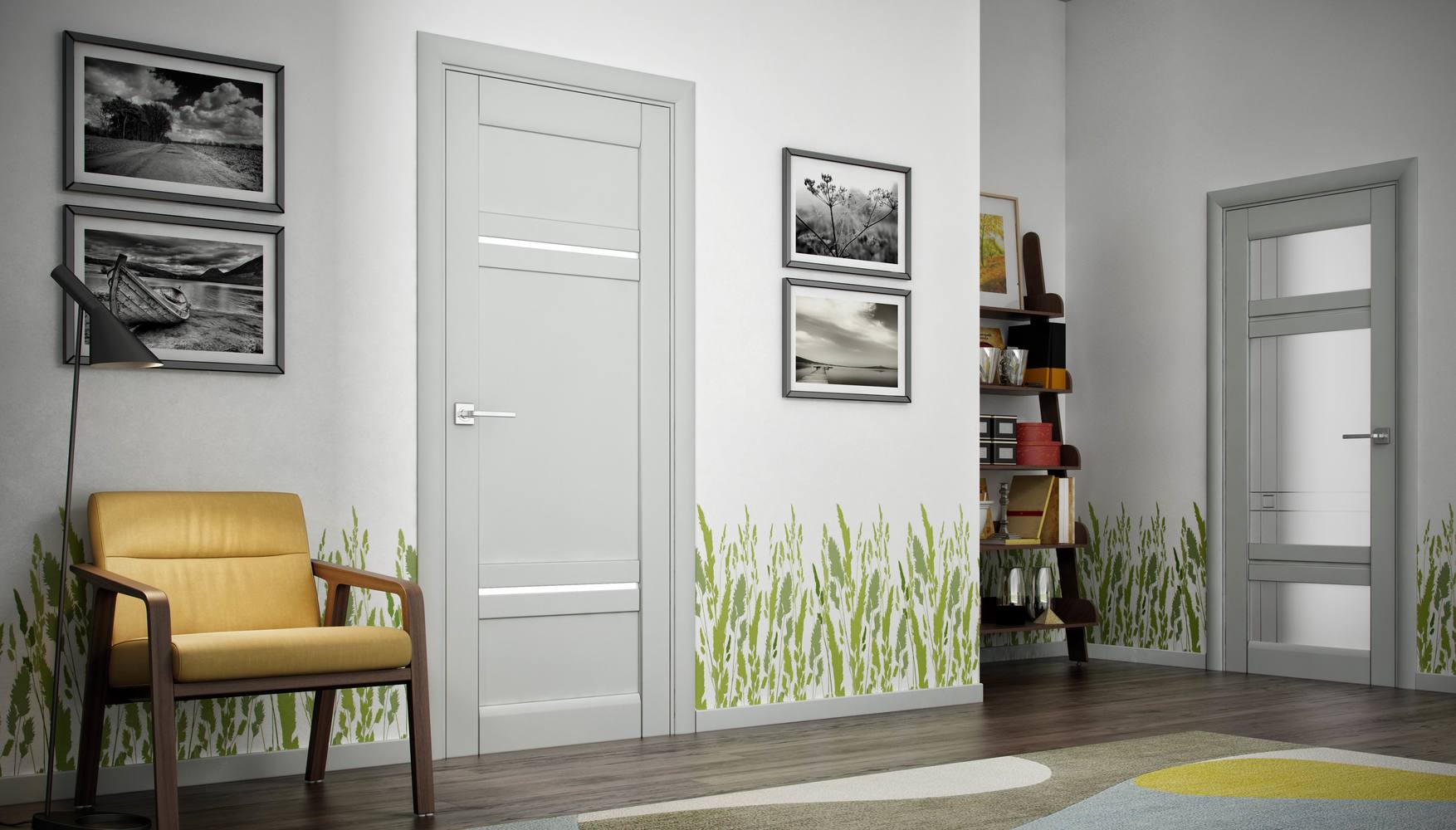 - серая дверь визуально увеличивает пространство спокойных тонов, это шикарный вариант для спальни или гостиной с элитным декором.