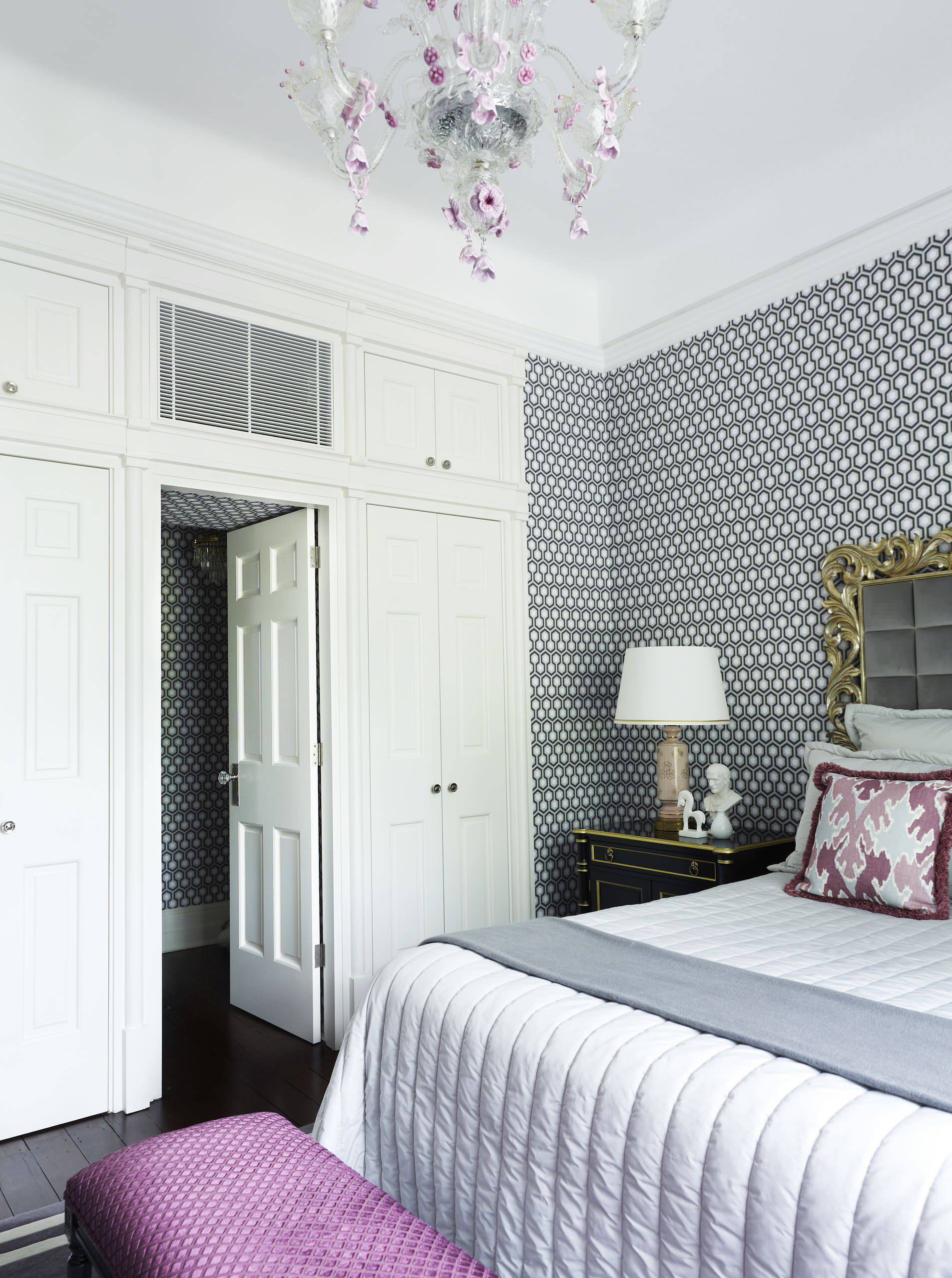 Чтобы маленькая белая спальня выглядела воздушной, но не безликой, оформление дополняют нежно-серые двери.