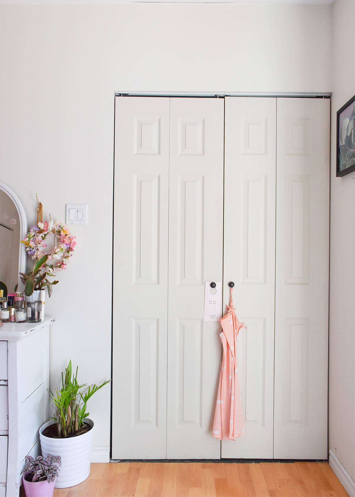 Есть те, кто посчитает светлое или белое дверное полотно скучным и бесцветным. Но ведь с другой стороны – это большой плюс, так как с помощью яркого декора (табличек, цветочных венков, картин) можно всегда преобразить дверь в комнате и задать нужное настроение.