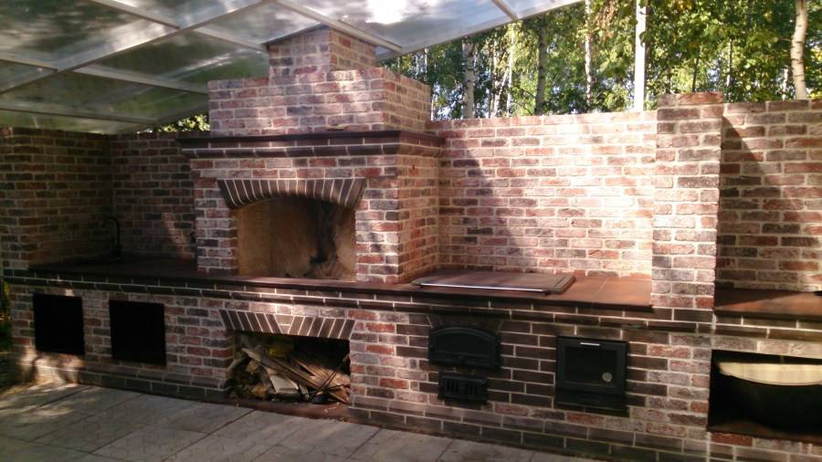 Центр конструкции – мангал из шамотного кирпича с металлическим коробом, решеткой и дымоходом. Под жаровней располагают поленницу. С боков от мангала оборудуют дополнительные отделы – русскую печь, тандыр, мойку, столешницу и другие функциональные пристройки.