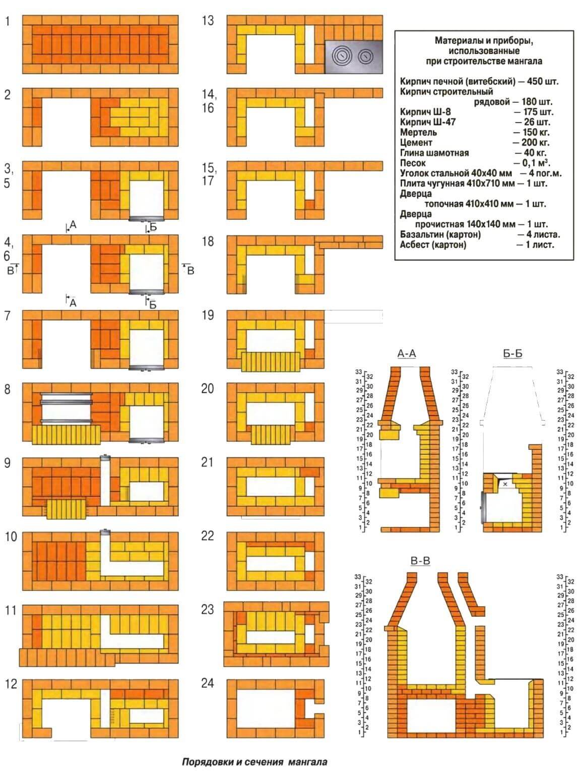 Обратите внимание: для выкладки печи барбекю своими руками используются два вида кирпича – обычный и огнеупорный. Обычный образует внешний контур, огнеупорный – внутренний