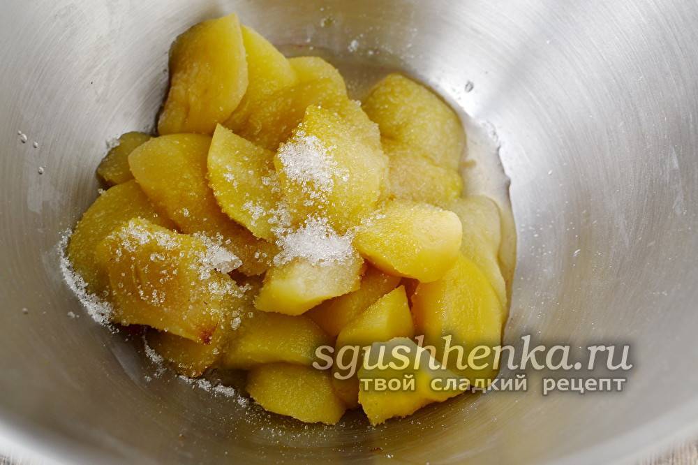 Фрукты очищают от шкурок и середины, нарезают кубиками. Последние помещают в формочку для запекания. Сверху вливают 2-3 ст. л. воды и накрывают все фольгой. Фрукты ставят в духовку, предварительно разогретую до 180 °C. Их запекают до их размягчения. У всех сортов на это уходит разное время. Однако в среднем это занимает в полчаса. Во время запекания яблок приступают к другим ингредиентам.