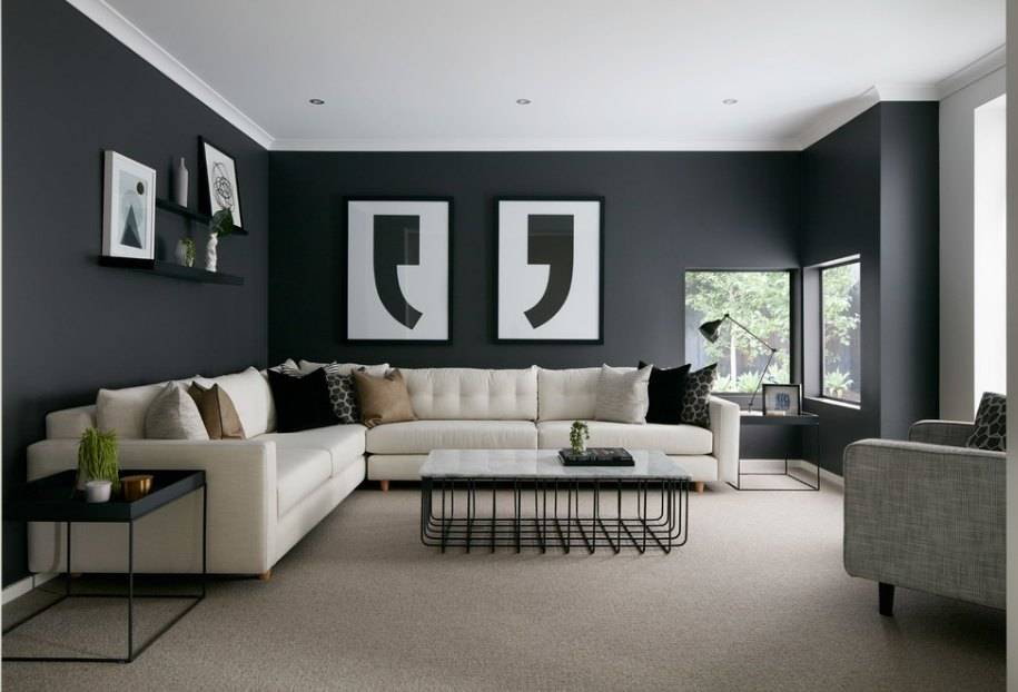 Гостиная. Может быть total black или использовать угольный исключительно на акцентах, мебели. В отделке сочетают краску, камень, обои, дерево.