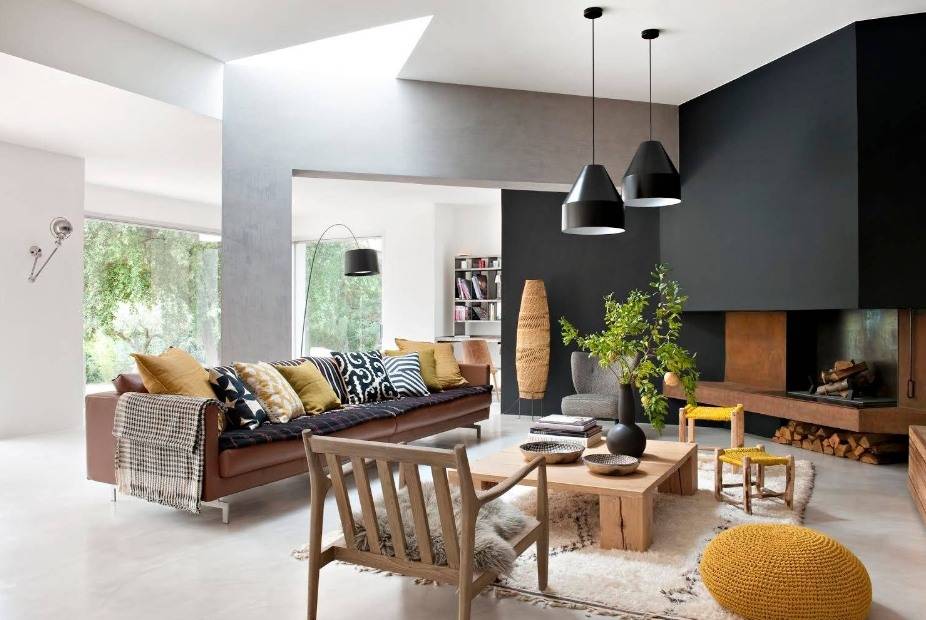 Гостиная. Может быть total black или использовать угольный исключительно на акцентах, мебели. В отделке сочетают краску, камень, обои, дерево.