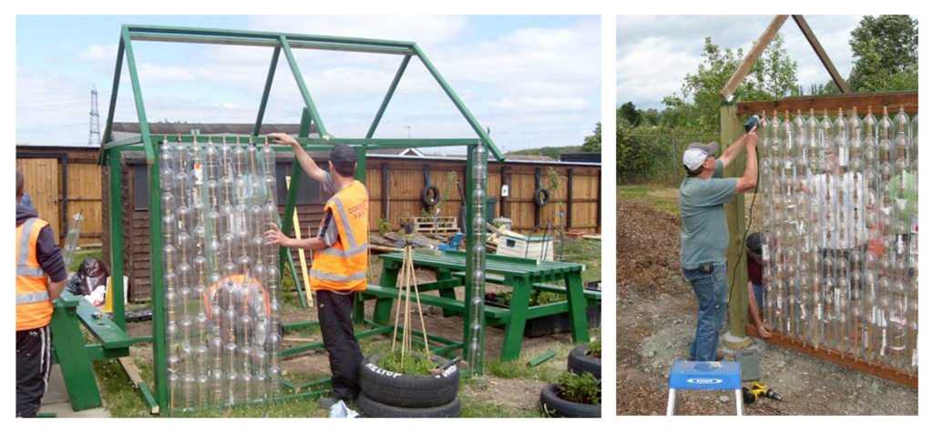 Ряды из пластиковых бутылок можно крепить как к дереву, так и металлу.