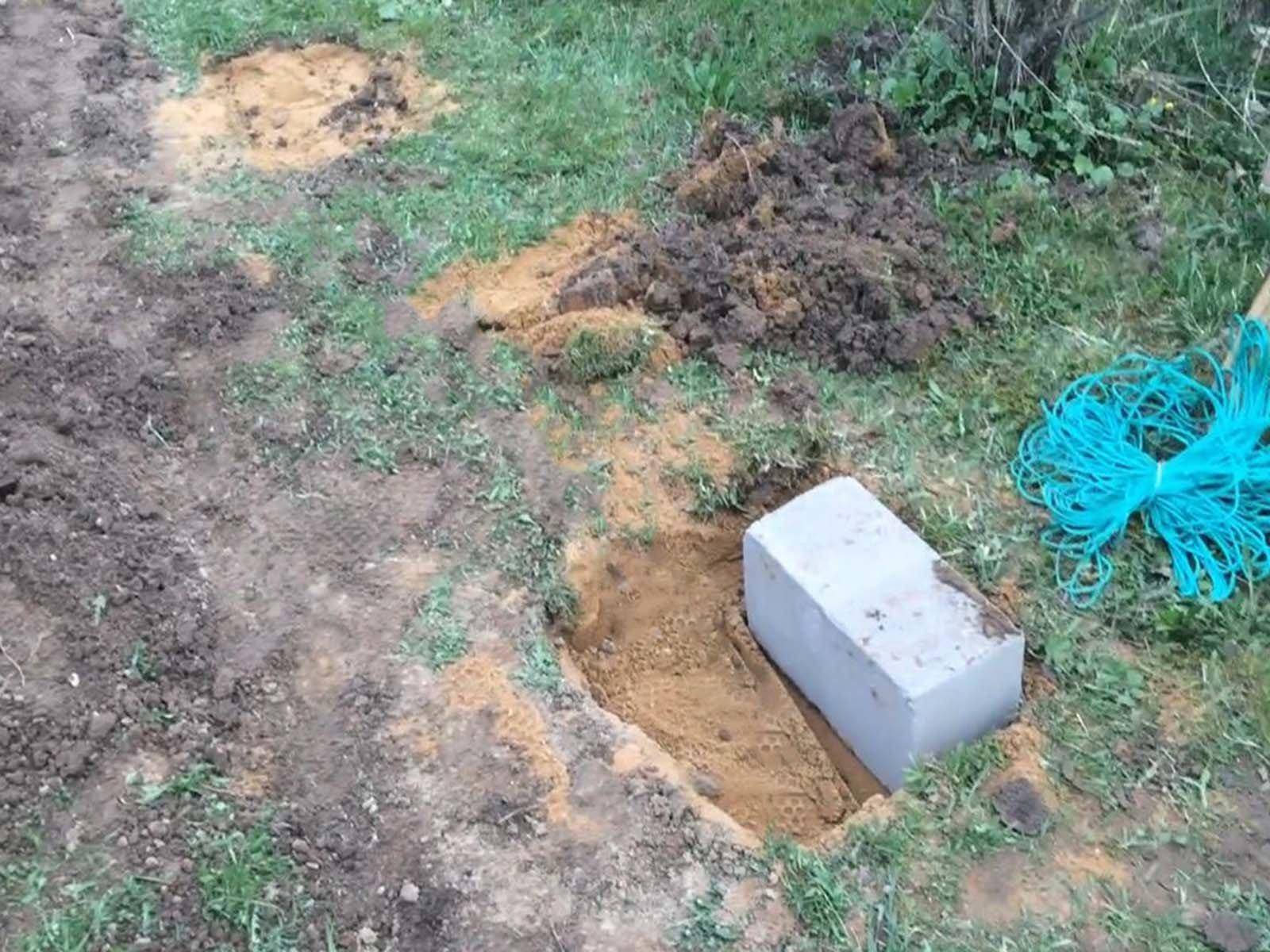 ШАГ 1: фундамент. В роли фундамента у нас будут зарыты в землю шлакоблоки. Необходимо выкопать 6 ямок и уложить в них шлакоблоки. Строительным уровнем выровняйте поверхность, чтобы все блоки были на одном уровне. Шлакоблоки, помещенные в яму, должны быть на пару сантиметров выше уровня земли. Ямки нужно делать по углам уличной дровницы и две по периметру, в центре. Это необходимо для исключения изгиба бруса по центру сооружения.