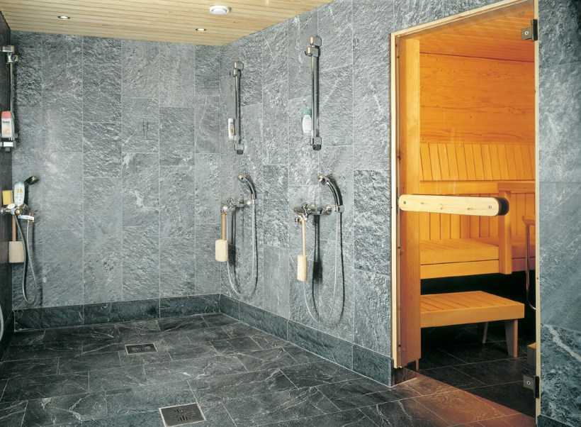 К отделке комнаты для мытья предъявляются менее строгие требования, чем при оформлении парной. Но, хотя в этой комнате нет таких высоких температур, влажность всегда очень высока. Таким образом, отделочные материалы подбирают с учётом влажности. Опытные мастера рекомендуют отдать предпочтение натуральным, экологически чистым воздухопроницаемым материалам. Эти свойства имеет дерево. Но другие материалы также часто используются, например: