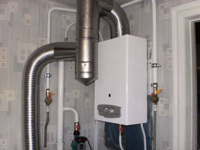 Для нормальной работы котла или газовой колонки требуется организация дымохода. В частных домах чаще всего прокладывается основательная шахта из кирпича и бетона. Если таковой нет в многоквартирном доме, то в стене проделывается отверстие, куда подводится труба отвода.