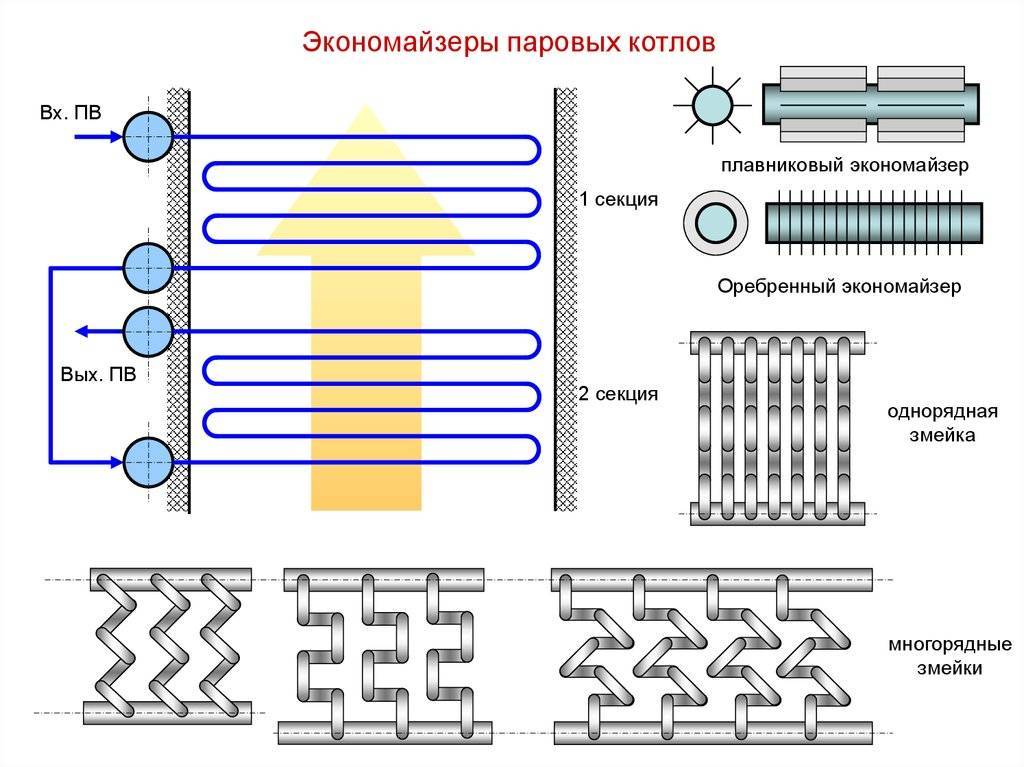 Для увеличения тепловосприятия, а также с целью изготовления экономайзеров с максимально компактными размерами, производители предусматривают вариант усовершенствования схемы стального оборудования. В связи с этим выделяют: