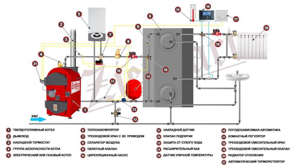 В сочетании твердотопливного и газового котла первый является резервным, рассчитанным на сильные морозы, периоды недоступности централизованной подачи топлива. В «спокойные» времена используется газовая топка.