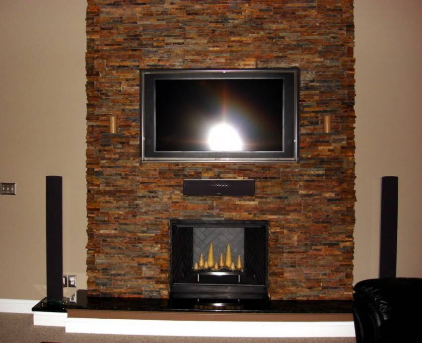 Совмещение – на самом деле камин и телевизор могут переставлять собой один блок. Пристенный или встроенный очаг оформляют сообразно стилю комнаты. Над ним на удобной высоте размещают телевизор. Учитывая, что в большинстве случаев речь идет о плоскоэкранной модели, сделать это очень просто.
