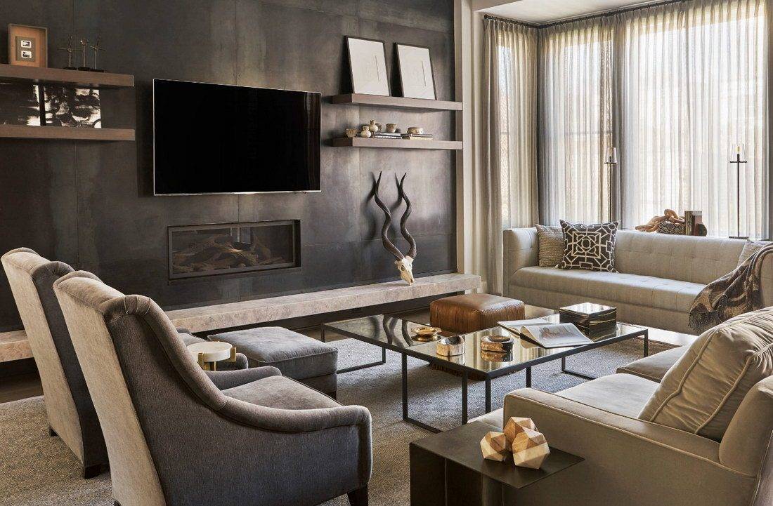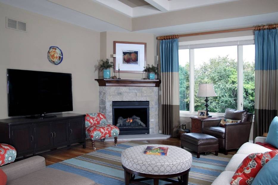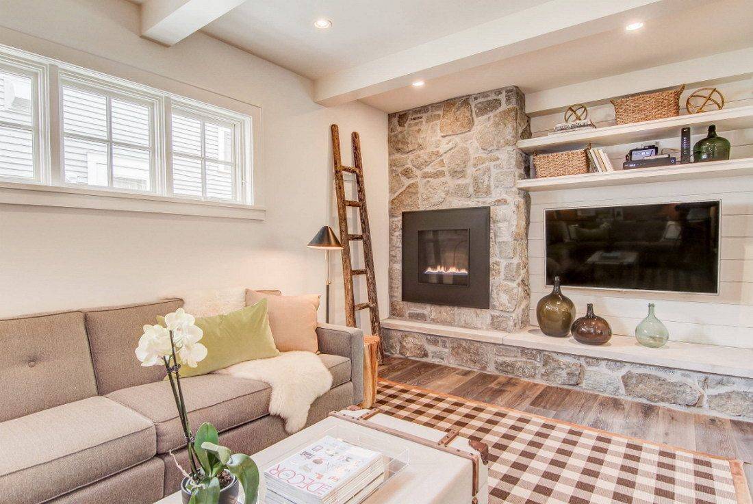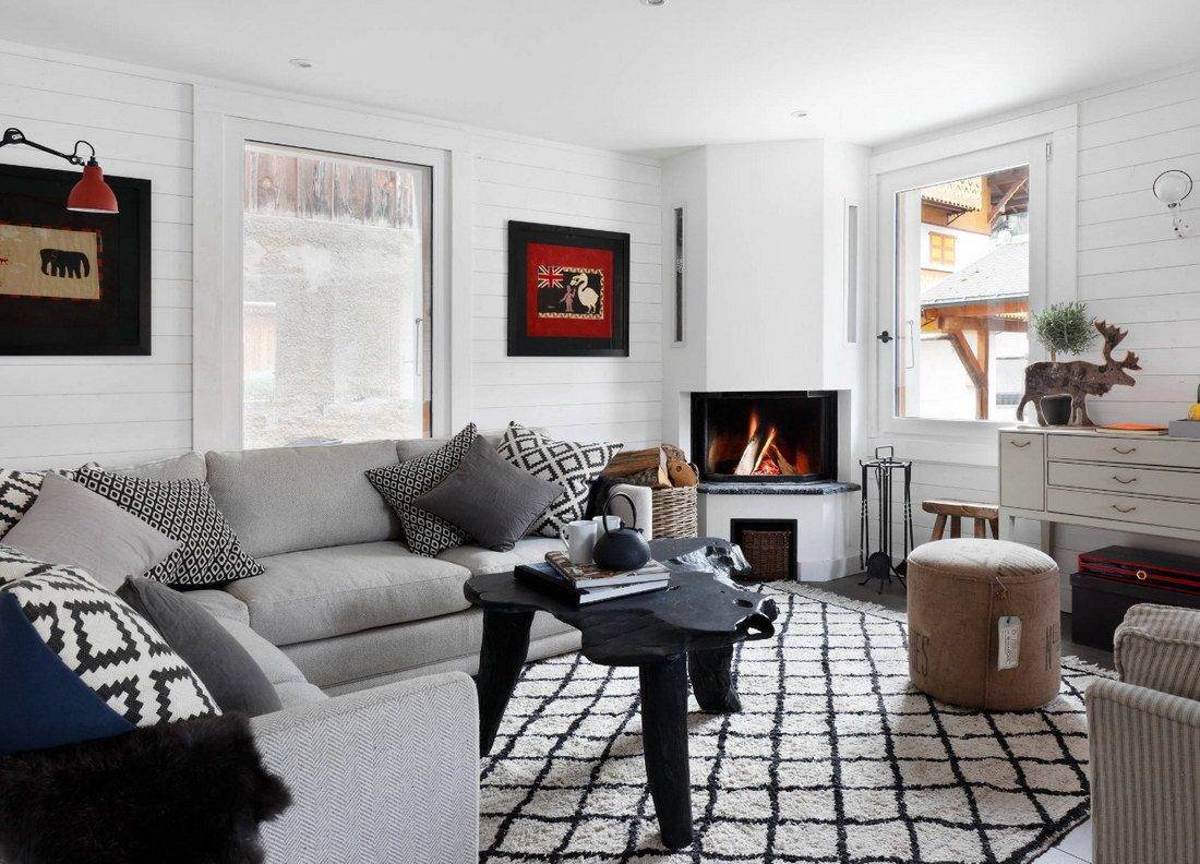 Своеобразной классикой стала лаунж-зона, которая состоит из нескольких кресел, торшера и стильного журнального столика. В некоторых случаях здесь также может быть расположен большой комфортный диван с декоративными подушками. Но всегда учитывайте параметры комнаты. Поскольку в узкой гостиной даже небольшое количество мебели может сделать камин незаметным. При желании это пространство можно дополнить небольшим пуфиком для ног или же креслом-качалкой. Независимо от выбранного варианта, рекомендуем расставлять предметы мебели не ближе, чем 1,5 м от источника огня. Это обусловлено правилами безопасности.
