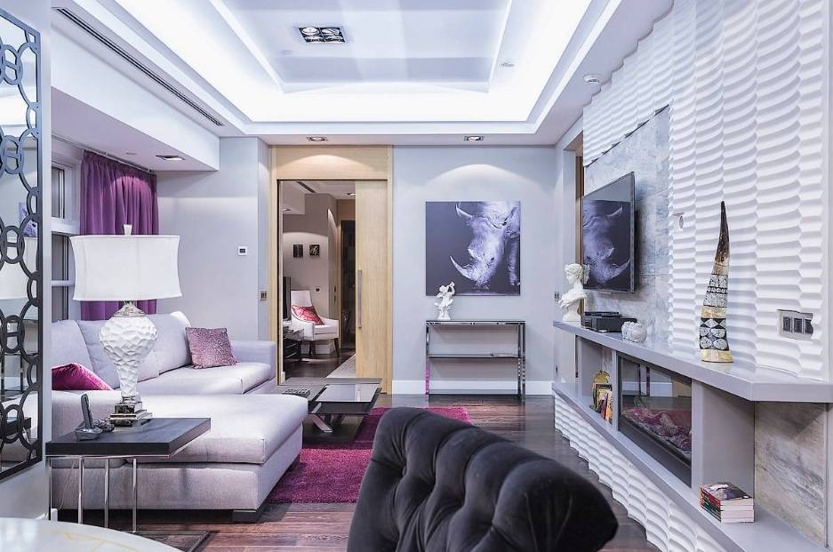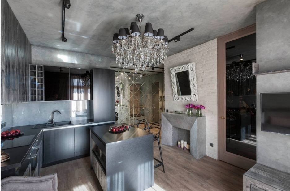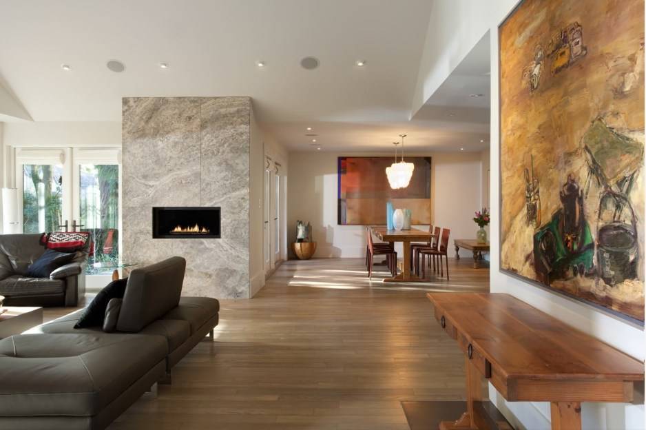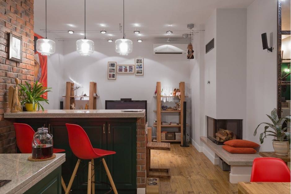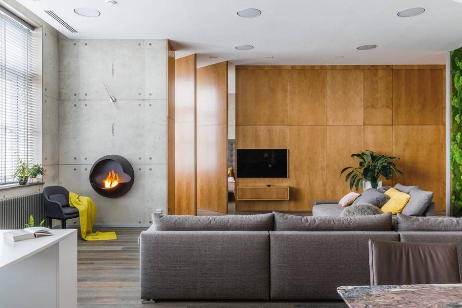 Комната, которая сочетает в себе гостиную и кухню или столовую – идеальное место для установки камина с живым пламенем. Многие дополнительно оборудуют место для барбекю, что очень удобно в холодное время года. Но если такая конструкция недопустима в вашем доме, то присмотритесь к камину с имитацией живого пламени. Они идеально смотрится в дизайне в стиле минимализм.