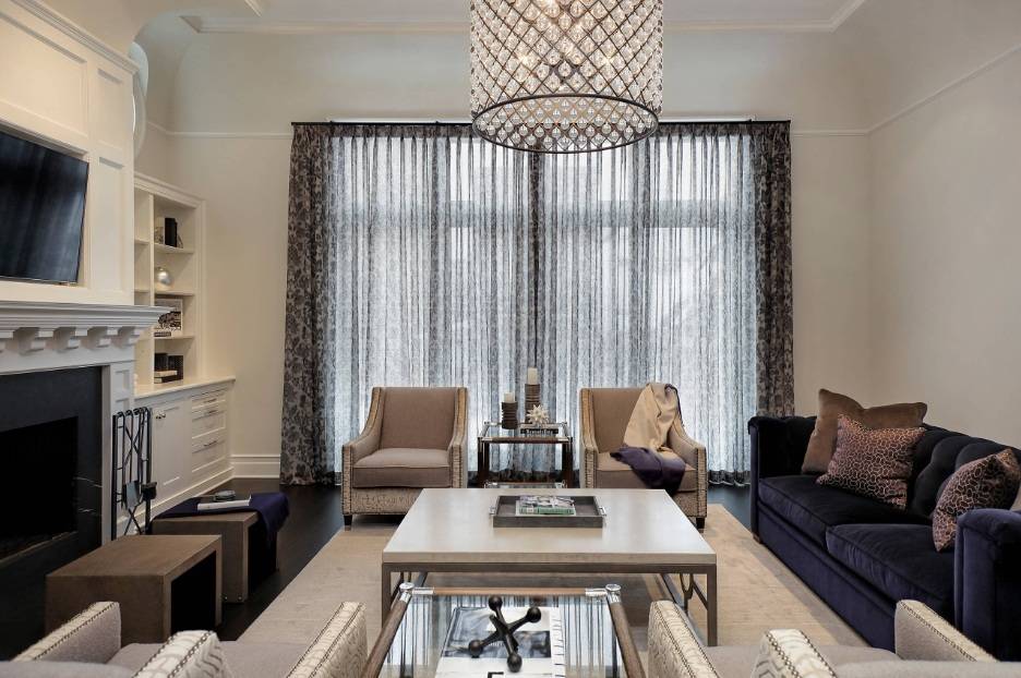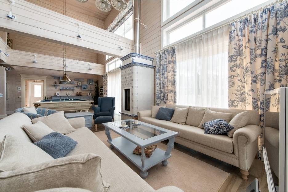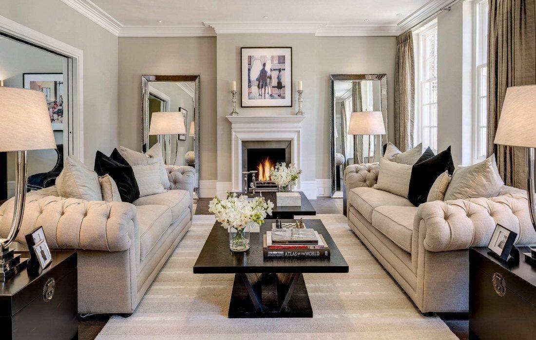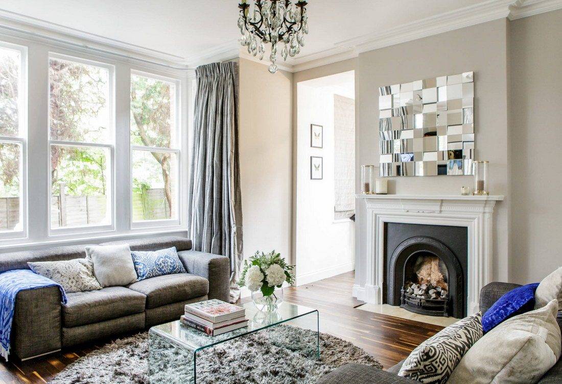 В целом можно сказать, что гостиная в большом доме просто создана для реализации интересных идей по ее оформлению. Речь идет не только о базовом наборе мебели, но и более интересных акцентах. К примеру, журнальный столик может быть выполнен из необычных материалов или в оригинальной форме. Многие и вовсе предпочитают сделать его самостоятельно. В качестве декора можно использовать совершенно разные предметы. Над камином отлично смотрится небольшая деревянная полка для книг или семейных настольных игр. При желании на ней также можно разместить памятные фотографии или же интересные фигурки. Особенно красиво над камином выглядит зеркало. Также в гостиной всегда уместными будут большие растения в горшках или вазах. Они добавляют нотку свежести в общий интерьер.