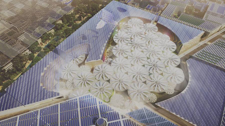 Проект «Petals from heaven» в центре Масдара — интерактивные зонтики открыты в дневное время, они защищают горожан от жары и поглощают солнечный свет, а ночью закрываются, чтобы выпустить сохраненное тепло