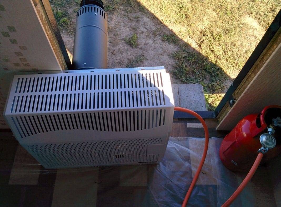 - Парапетные обогреватели более экологичны и безопасны. Забор воздуха и отвод дымовых газов в них производится через коаксиальную трубу, которую прокладывают через наружную стену на улицу. Тяга в этом случае поддерживается встроенным вентилятором.